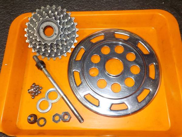 chrome headset, fork crown, handlebars, rims, crankset, & stick-shifter