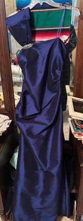 Beautiful NEVER WORN dark blue satiny long gown. Size 8. Tags still on...bought at Ross 2 years ago for $40. Will take $20. Pls email if interested. I won't provide my phone number. Will meet you...
