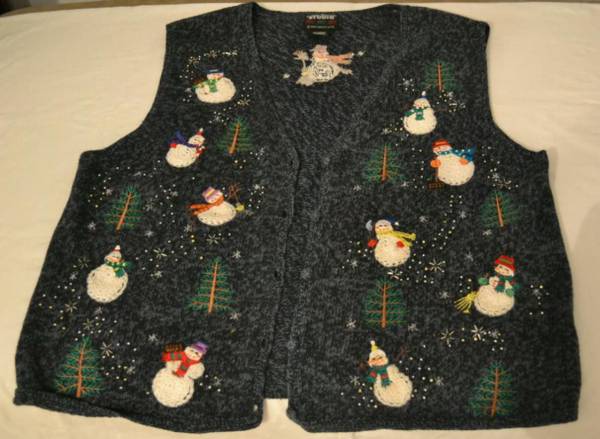Nicely made vest with fabric covered buttons made of the same material as the vest. Embroidered snowmen and trees with beaded accents on the front of the vest with one snowman on the back of the vest.