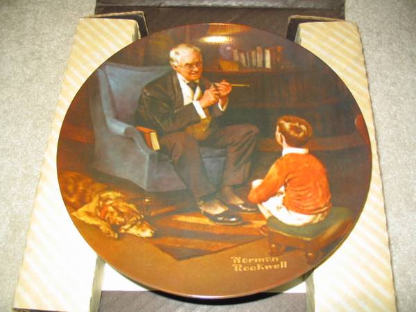 A set of seven Norman Rockwell vintage ceramic plates. Six are Edwin M. Knowles from the Bradford Exchange, and one is from River Shore Ltd. Plates. Includes "The Lightkeepers Daughter," "The Music Maker," "The Tycoon," "The Painter," " The Storyteller," and "The Gourmet." Plates are 8 1/2" diameter except the River Shore plate, "Spring Flowers," the only known still-life by Norman Rockwell, is 10 1/2" diameter. All plates come in original boxes with original Certificate of Authenticity. Plates never been out of box for use and are in like-new condition. Asking $42 for full set of 7 plates.