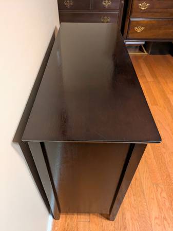 Like new condition. This console has a classic design with a dark espresso finish. It features two tempered glass doors for display purposes and two lower drawers for concealed storage.