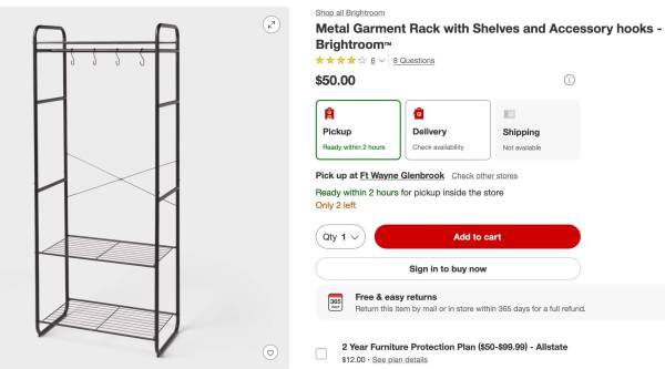 Steel frame garment rack Includes 2-tier shelf and hooks 63in H x 26in W x 14.5in D