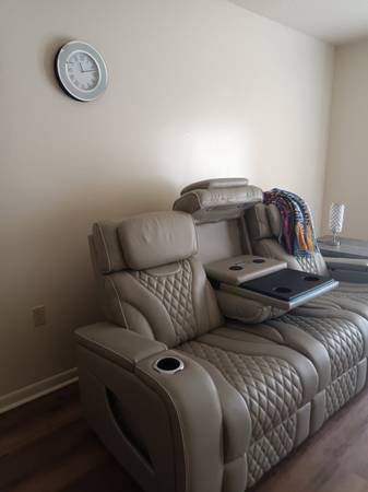 I have a used power sofa with reading lights in center(head) and console with recharge platelets. One side reclines and the other side needs a power cord. Very good condition. Price purchased was $2,000 but asking for $950 since the other side needs a cord and wire adjustiment. No animal hair or tares on sofa. It has a total of 4 cup holders, two magazine racks on both sides, both arm lifts has the remote inside. It's a light grey with off white trim. It has theatre lights aligned(with timer). Color blue. Must be able to pick up and also pay with cash.
