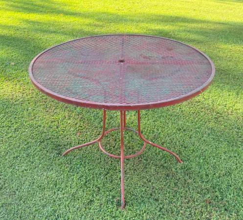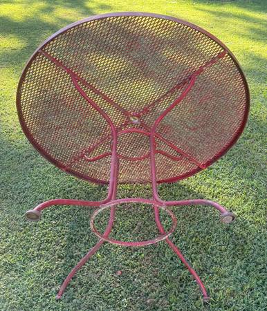 Vintage Mid Century Modern Woodard Iron Round Mesh Top Outdoor Garden Patio Table Dimensions: 28-1/2” H x 41-1/8” in diameter (across)