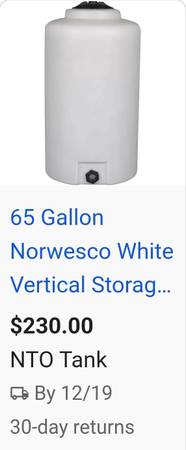 65-Gallon Norwesco Vertical Storage Tank for bulk chemical & liquid storage in the industrial, agricultural and commercial industries. Norwesco vertical tanks feature tie-down slots, built-in graduated gallon indicators, a fill-opening and a self-vented, slosh-proof lid. Constructed with a UV stabilized resin and a specific gravity rating of 1.5 (12.5 lbs per gallon).
