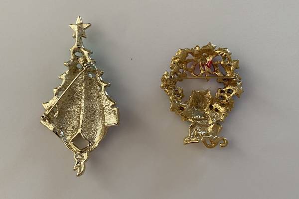 Two Gold, Red and Green Cat Christmas Pins, $5 each