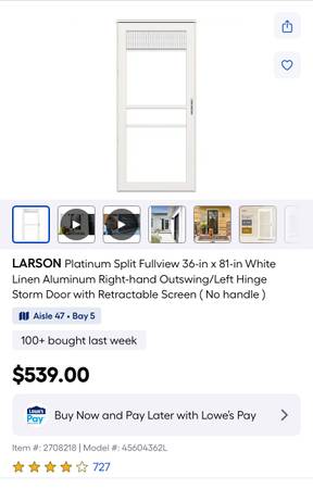 New still in unopened box- LARSON Platinum Split Fullview 36-in x 81-in White Linen Aluminum Right-hand Outswing/Left Hinge Storm Door with Retractable Screen ( No handle ) Item #2708218 | 1 - white...